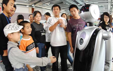 Updated: 2008-10-18 18:46 ![]() Visitors look at an intelligent robot during a robot expo in Hangzhou, East China's Zhejiang Province, October 18, 2008. [Xinhua]