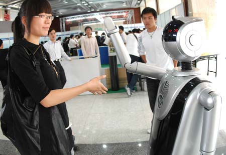 Updated: 2008-10-18 18:46 ![]() A girl extends to shake hands with an intelligent robot during a robot expo in Hangzhou, East China's Zhejiang Province, October 18, 2008. [Xinhua]