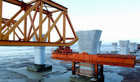 The Qingdao Gulf Bridge, an over 35 kilometer long huge sea-flyover designed to connect two peninsulas of the Jiaozhou Bay, is now busy under construction in east China's coastal province of Shandong. The Qingdao Gulf Bridge is the first major comprehensive bridge project ever undertaken in the cold, frost-prone coastal areas of north China, Xinhua News Agency reported on Thursday. The entire length of the bridge will be 35.4 kilometers. So far, over 80 percent of its pier foundations and nearly half of its pier pillars have been completed. The bridge is scheduled to be put into use in 2010. Connecting city Qindao in the northeast and Huangdao in the southwest across the Jiaozhou Bay, the bridge will cut the driving time from the city to the Economic and Technological Development Area in Huangdao by 20 minutes and the distance by 30 kilometers. |