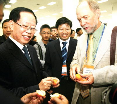 Chinese Vice Minister of Agriculture Wei Chaoan (L), President of Huazhong University of Agriculture (C) and an American citrus expert(R) taste tangerines planted by local farmers at the 11th International Citrus Conference in Wuhan, Central China's Hubei province, October 26, 2008. [Yangtze River Times]