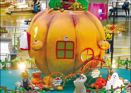 Updated: 2008-10-28 13:59 ![]() A 5-meter-high pumpkin lamp on display in the Super Brand Mall on Sunday. There are about 1,000 other pumpkin lamps on display, all made by children for Halloween that falls on October 31. [Shanghai Daily]