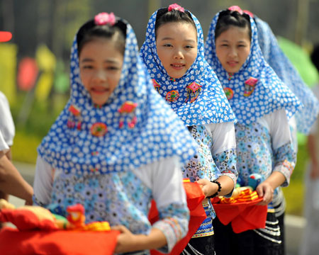 Updated: 2008-10-29 00:08 ![]() Stewardesses in traditional local costumes are seen during an award ceremony of the Sixth National Farmer's Games in Quanzhou City, East China's Fujian Province, October 28, 2008. Around 3,500 rural residents from around the country will compete in sports ranging from the more traditional basketball and athletics to tailored ones such as tyre-pushing and tug-of-war. [Xinhua]