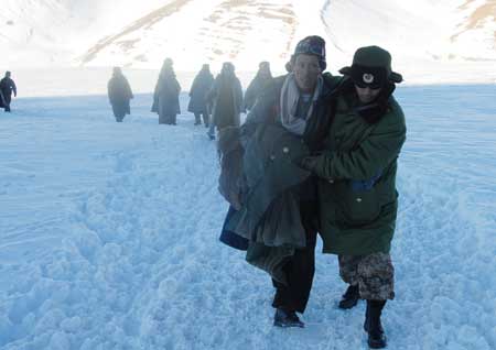 Updated: 2008-10-30 22:09 ![]() Soldiers rescue a farmer stranded due to heavy snow in Shannan prefecture, southwest China's Tibet Autonomous Region Oct. 30, 2008. [Xinhua] |