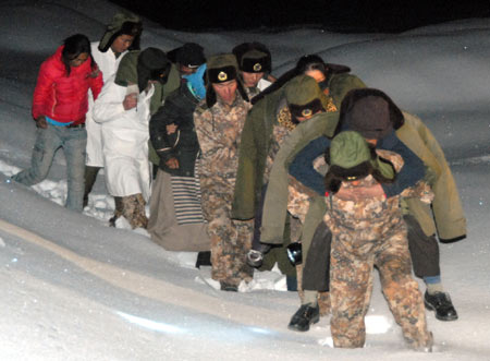 ![]() Soldiers help stranded farmers evacuated from the snow-stricken Cona county, southwest China's Tibet Autonomous Region, October 31, 2008. Over 2,500 people affected by the storm have been transferred to safer areas by 8:00 am, November 2, 2008, said local officials. [Xinhua] |