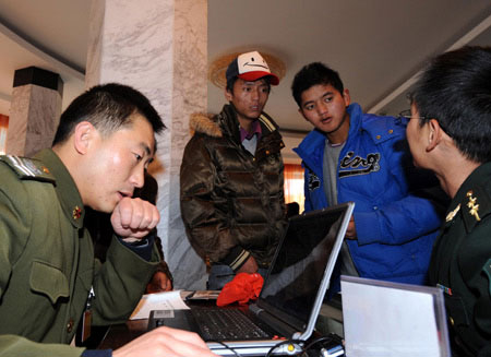 Updated: 2008-11-03 09:41 Two young men consult officers during the military recruitment in Lhasa, capital of southwest China's Tibet Autonomous Region on Saturday, November 1, 2008. China's People's Liberation Army (PLA) started the yearly nationwide winter recruitment on Saturday. [Xinhua] |