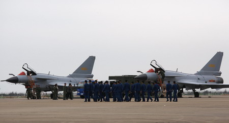 The People's Liberation Army Air Force personnel walk past two Chengdu J-10 fighter jets one day before the opening of the 7th China International Aviation & Aerospace Exhibition, or Airshow China 2008, in the southern Chinese city of Zhuhai November 3, 2008. About 600 exhibitors with more than 60 aircraft, representing 35 countries and regions, have registered to take part in the show. [Agencies]