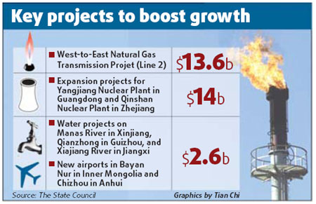 The latest announcement by the State Council, or Cabinet, add to efforts to spur economic growth following the release of a 4-trillion yuan ($586-billion) stimulus plan on Sunday. An executive meeting, presided over by Premier Wen Jiabao, approved projects with a combined investment of more than 200 billion yuan ($29 billion) designed to help boost domestic demand (see infographic for breakup). ![]() They include a gas pipeline from the Ningxia Hui autonomous region to Guangzhou, Guangdong province, and Hong Kong; expansion projects for two nuclear power plants in Guangdong and Zhejiang provinces; water conservancy projects in the Xinjiang Uygur autonomous region, and Guizhou and Jiangxi provinces; and new airports in Anhui province and the Inner Mongolia autonomous region. The meeting also decided to raise export rebates, effective Dec 1, on 3,770 export products, or about 28 percent of the total. They are mainly in the labor-intensive, and mechanical and electrical product sectors. It did not release details of the size of the rebates or which products would be affected but was the third such move in the second half. The measures add to a series of urgent steps taken by Beijing to reverse a sharp downturn in economic growth. Growth fell to 9 percent in the latest quarter - still strong for a major economy, but well below last year's 11.9 percent. A drop in global demand for Chinese goods has hit exporters hard, prompting layoffs and factory closures. The steps are meant to "expand domestic consumption and promote economic stability", the State Council said in a statement on its website. Other measures agreed upon at the meeting include: The 300-billion-yuan reconstruction fund dedicated to 51 hard-hit areas in Sichuan, Gansu and Shaanxi provinces will provide the main financing for the May 12 quake zone. The forestry industry, ravaged by snowstorms at the start of the year and the earthquake, will receive support for restoration by 2010. "Proper subsidies" will be given to forestry workers to help rebuild damaged homes. The State will use "protective prices" in purchase of damaged bamboo and lumber, and urged financial institutions to give greater support or write off bad loans due to disasters in the sector. The $586-billion stimulus package calls for high spending on government construction projects, aid to the poor and farmers and tax cuts for exporters over the next two years. It covers 10 major areas, including affordable housing, rural infrastructure, water, electricity, transport, the environment, technological innovation and rebuilding after disasters, especially the Sichuan quake. The plan calls for speeding up projects that were already planned; and depends on domestic companies for a big share of the spending. |