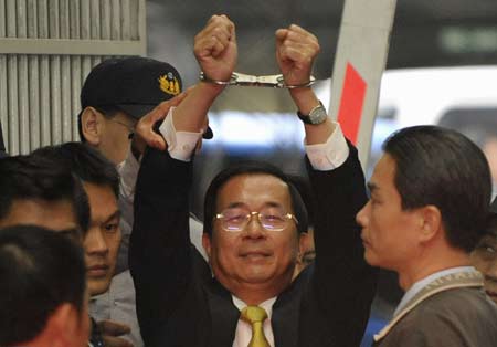 "His case has nothing to do with placating the mainland," he said, "It is a case of bringing a corrupt leader to justice." Chen, 57, "president" of Taiwan from 2000 until May of this year, was detained on Tuesday, and arrested after a 21-hour court hearing. The hearing was interrupted for several hours after the former leader complained he had been injured while being transported to the court building. He was returned to the court after doctors found he had sustained only a minor muscle tear, court spokesman Huang Chun-ming said. Chen was arrested on suspicion of graft, bribery, forgery, money laundering and illegal possession of public assets, the Taipei District Court said in a statement. "After questioning the suspect, the court believes his crimes to be severe, and there are enough facts to believe there is buried evidence, fabrication, altered evidence and conspiracy among suspects or witnesses," it said. Although Chen has not been formally charged, he can be held for four months, most likely in a jail in Taipei. He has denied any wrongdoing. Chen's arrest - the first of a former Taiwan "president" - and the suspicion surrounding others in the case has cast a shadow over his pro-independence Democratic Progressive Party, which is now the main opposition party after its landslide defeat in the "legislative" and "presidential" elections in May. Chen has cast himself as a victim in the case, saying the aggressive investigation is the result of behind-the-scenes pressure from the ruling Kuomintang, which favors closer ties with the mainland. The list of suspected crimes merges two cases, one involving misuse of a confidential "State" affairs fund and the other related to money laundering, a prosecutor's spokesman said. |
