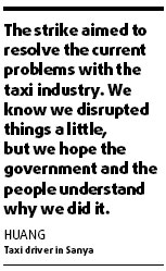 Updated: 2008-11-14 07:11 HAIKOU: Taxi drivers in Sanya, Hainan province, went back to work on Thursday, bringing to a close their three-day protest, local authorities said in a press release. About 200 drivers had been protesting since Monday in front of the city's government building.