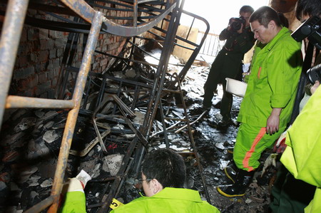 Firefighters inspect the dorm room after putting out a fire in it at the Shanghai Business School November 14, 2008. [Xinhua]