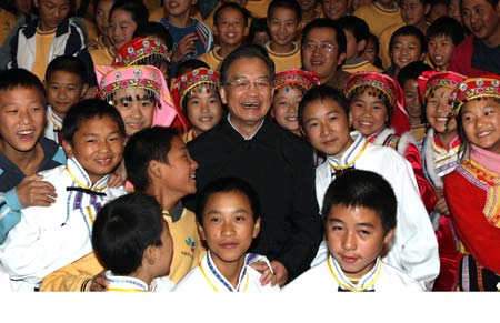 Chinese Premier Wen Jiabao (C) poses for a group photo with students of the Beichuan Middle School, Mianyang City, Southwest China's Sichuan Province, November 15, 2008. [Xinhua]