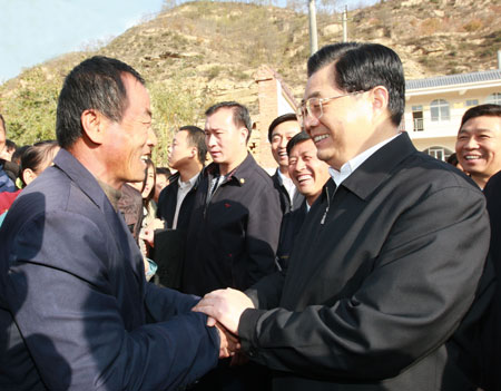 BEIJING - Chinese President Hu Jintao recently made a site tour in Ansai County, Shaanxi Province, to publicize a campaign for the Scientific Concept of Development. It's an ideology with the same principles of the previous Party leaders' theories known as Mao Zedong Thought, Deng Xiaoping Theory and the Important Thought of "Three Represents". The theories all say the CPC has always represented the most advanced productivity and culture in China, as well as the most fundamental interests of the majority of the Chinese people. During his tour, which took place October 29-31, Hu explained the Scientific Concept of Development which was adopted at the Third Plenary Session of the Seventeenth CPC Central Committee. While talking with villagers in Hougoumen, Ansai County, Hu said the new policies, based on a practice of the Scientific Concept of Development,will bring substantial benefits to farmers by allowing them to lease their rights to contract cultivated land and forests. In the past, villagers were not allowed to lease their rights and as a result, their land was left unattended when they went to cities as transient workers. "I believe that with the good policies of the Party and the hard efforts by the villagers, you will lead a better life in the future," said Hu, who is also the general secretary of the CPC and chairman of the Central Military Commission. This is his second visit to Hougoumen Village. On the eve of the traditional Chinese Lunar New Year in 2006, Hu spent the festival night with villagers, having meals and joining in festive activities including a traditional dance. Ansai, a county subordinate to Yan'an City, is Hu's site for the on-the-spot study of the ideological drive. Yan'an served as the capital for the CPC-led revolutionary base during the 1930s-40s, before the Party took over the power in 1949. During his stay in Hougoumen this October, Hu learned about new progress made by the leadership of the village's Party branch. The villagers have had their income remarkably increased and their living standards much improved, Hu was told. |