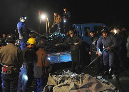Updated: 2008-11-18 00:22 Rescuers race against time to search and rescue miners trapped in a flooded Gaomendong coal mineons, Pingdingshan City, Central China's Henan Province, November 17, 2008. 34 people were trapped in this coal mine that flooded early Monday morning. [Xinhua] |