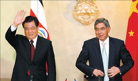 SAN JOSE: China and Costa Rica will launch free trade talks in January and hope to seal a deal by 2010, President Hu Jintao said on Monday. After meeting with his Costa Rican counterpart Oscar Arias during his first visit to a Central American country, Hu said: "The development of cooperation and friendship between China and Costa Rica meets the fundamental interests of our people and will also support different sectors of our societies." The talks on free trade area (FTA) will start on January 19 in Costa Rica's capital San Jose and end before Arias leaves office in May 2010. By doing so, Costa Rica will become the third Latin American country to negotiate a free trade deal with China, after Chile and Peru, which may conclude its accord during Hu's visit later this month. Costa Rica's Foreign Trade Minister Marco Vinicio Ruiz said a free trade accord with China means "there will be many sectors that benefit, especially those tied to agricultural and meat products". Costa Rica last year exported $848 million worth of goods to China and last year's bilateral trade amounted to $2.8 billion, a 33 percent increase on the previous year. Hu and Arias, who visited China last year, also witnessed the signing of 11 deals, from setting up Chinese language institutes to opening a line of credit for $40 million from China. They agreed to set up a joint venture including China's National Petroleum Corporation to help modernize Costa Rica's state-owned oil refinery, with an investment of up to $1.2 billion. China also agreed to help Costa Rica build a national sports stadium. "We would like to see an increase in Costa Rican imports and we invite Costa Rican companies to explore the Chinese market," Hu said. Noting the fast growth in bilateral ties over the past year, Hu said the two countries have also carried out fruitful cooperation in international and regional affairs. "Facts have proven that the establishment of diplomatic ties between China and Costa Rica conforms to the fundamental and long-term interests of both countries," Hu said. The two countries established diplomatic ties in June 2007 after Costa Rica broke off its relationship with Taiwan. "China is ready to work with Costa Rica to open up a bright future for bilateral ties characterized by mutual respect, equality, mutual benefit, sincere cooperation and friendship for generations to come," Hu said. The Chinese government will also support pragmatic cooperation between enterprises of the two countries in such key areas as infrastructure, agriculture, telecommunications and energy, he added. Arias said Costa Rica hopes to strengthen cooperation with China in port construction and development of hi-tech parks, as well as Chinese language teaching. Arias added that he also hoped the two countries would establish a dialogue mechanism at a higher level so as to further promote the development of bilateral ties. Hu also met with Francisco Pacheco, president of the Costa Rican Legislative Assembly, on Monday. China Daily - Agencies (China Daily 11/19/2008 page6) |