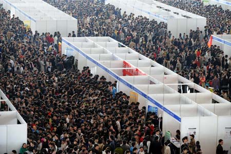 The rate, the sole index that measures the jobless but excludes migrant workers, could hit 4.5 percent by the year-end, Yin's deputy Zhang Xiaojian said. The unemployment scenario could get worse in the first quarter of next year, said Yin, but added he expects the situation to improve in the second quarter when government measures to boost domestic demand start to yield results. The country is battling rising unemployment mainly because of a falling demand for its export-oriented products amid the global financial meltdown. Yin said small and medium enterprises in labor-intensive sectors have suffered the biggest job losses. Manufacturing hubs, especially in Zhejiang and Guangdong provinces, have witnessed many factory closures, production cuts and massive lay-offs. "The current situation is grim, and the impact (of the crisis) is still unfolding," Yin said. Job seekers in some cities outnumber vacancies by 2-1. The numbers of college graduates will rise from 5.59 million this year to 6.1 million next year. Altogether 24 million people will enter the labor market, competing for the 12 million jobs cities can generate, Zhang said. Government agencies will try to spur employment of graduates in the private sector or offer them incentives to take up jobs in remote and underdeveloped regions, he said. Economists said the government will try to maintain GDP growth above 8 percent to keep the job market stable. The economy grew 9 percent in the third quarter after expanding 11.9 percent last year, and economists warn of further declines. In face of the grave situation, labor unrest has become the "top concern" for the authorities, Yin said. Workers in some southern and coastal regions reportedly gathered in front of closed factory gates last month demanding unpaid wages after their bosses fled. Yin said the government will strive to solve disputes before they get out of control, and set up a fast-track mechanism to deal with them. "Employment stability is the top priority for China," he said. The government is trying to help firms minimize job losses, and ensure those that do lay off workers abide by labor laws, Yin said. For example, large and medium firms in Hubei province have been asked to lower salaries rather than laying off workers. They need local government approval before laying off more than 50 people at one go. Agencies contribute to the story |