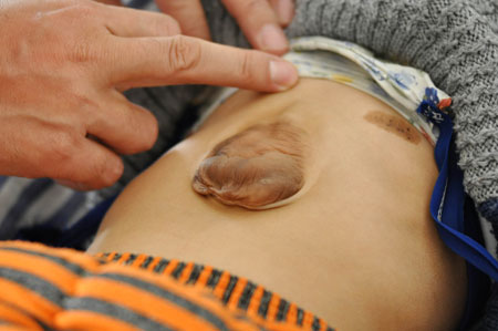 Updated: 2008-11-21 21:20 ![]() A doctor examines a 5-year-old patient with Pentalogy of Cantrell, in which case the boy's heart is covered only by the skin, in Shengjing Hospital in Shenyang, Liaoning Province, November 21, 2008. Pentalogy of Cantrell is a rare anomaly occurring in approximately five in one million live births. [CFP]