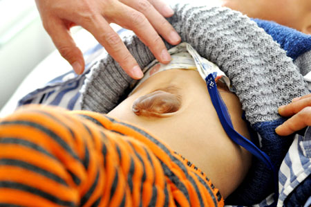Updated: 2008-11-21 21:20 ![]() A doctor examines a 5-year-old patient with Pentalogy of Cantrell, in which case the boy's heart is covered only by the skin, in Shengjing Hospital in Shenyang, Liaoning Province, November 21, 2008. Pentalogy of Cantrell is a rare anomaly occurring in approximately five in one million live births. [CFP]