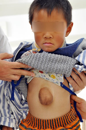 Updated: 2008-11-21 21:20 ![]() A doctor examines a 5-year-old patient with Pentalogy of Cantrell, in which case the boy's heart is covered only by the skin, in Shengjing Hospital in Shenyang, Liaoning Province, November 21, 2008. Pentalogy of Cantrell is a rare anomaly occurring in approximately five in one million live births. [CFP]