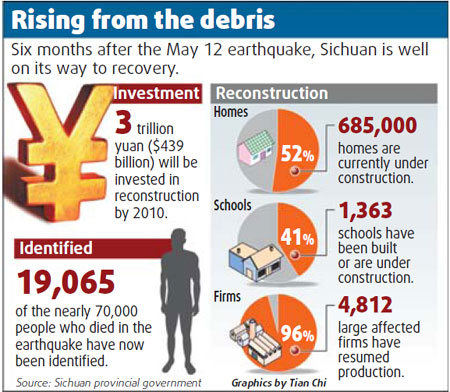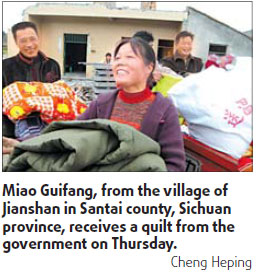 Wei Hong, executive vice-governor of Sichuan, told a briefing in Beijing that 195,000 homes, less than 16 percent of the total needed, have so far been built. An additional 685,000 are under construction, he said. The average winter temperature in the quake zone is forecast to be 0.5 to 1 C lower than in previous years, he said. "Our top priority is to ensure that thousands of affected people, especially those living in extremely cold and remote rural areas, are safe and warm through the winter," Wei said. In places such as Beichuan, which is yet to find a new home, almost 6,500 families are still living in tents, he said. Millions of others displaced by the quake are in need of quilts and repairs to their homes if they are to survive the winter cold, he said. Chen Kefu, deputy director of Sichuan's civil affairs department, said about 330,000 quilts are still needed, as well as other items such as electric blankets and heaters.