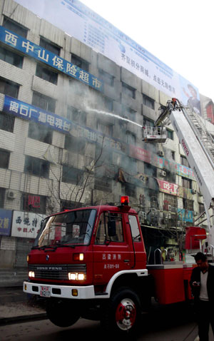 Updated: 2008-11-22 17:47 ![]() Firefighters extinguish a fire at a hotel in Lvliang City, East China's Shandong Province, November 22, 2008. Eight people were killed in the fire.[Xinhua]