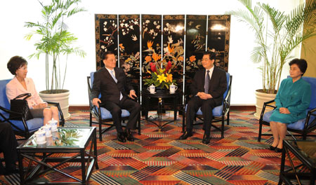 LIMA -- Hu Jintao, general secretary of the Central Committee of the Communist Party of China, met here Friday with Kuomintang (KMT) Honorary Chairman Lien Chan. At their meeting, Hu spoke highly of Lien's unremitting efforts in and contributions to the peaceful development of cross-Strait relations. Both leaders are in the Peruvian capital Lima to attend the 16th Economic Leaders' Meeting of the Asia-Pacific Economic Cooperation (APEC).