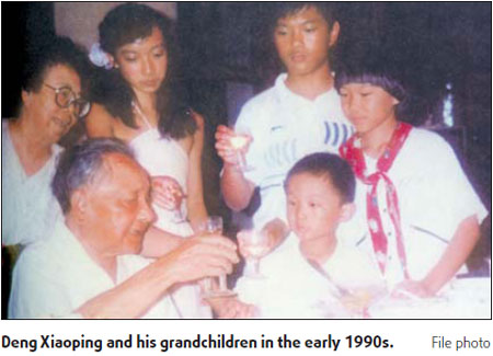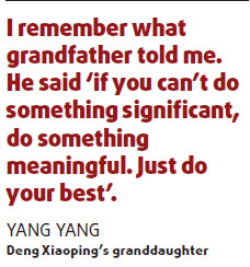 Yang Yang devotes her adult life to helping those less fortunate. Her next events are star-studded affairs in Beijing tomorrow and Saturday, and promise to be her most successful yet. And every day, she is inspired by her grandfather. He was none other than Deng Xiaoping, the former leader of China. His influence on her life is immense, even surreal. Born in Oct 1979 as the only child of Deng's youngest daughter Deng Rong, Yang Yang grew up with her grandfather and her extended family in Beijing. "We enjoyed family life together - grandparents, parents, uncles, aunts and cousins - over a dozen people, very warm and jolly. My grandmother is over 90 but still healthy. Growing up in such a big family, I never felt I was the only child of my parents," Yang Yang says. Nor was she ever allowed to feel special, better than other children. "Like every ordinary kid, I went to school on my bicycle or bus every morning," she says. "After school, my cousins and I would go to grandfather's room. He would give us chocolates and watch cartoons on TV with us. "He saw our school reports every semester but rarely commented much about our scores or told us what to do. I think he hoped we would become well informed about life. "Every year, he took us to plant trees, visit factories and go to swim in Beidaihe." Deng took her and her cousins on his tours of Shenzhen and Shanghai in the early 1990s, even though they couldn't even begin to realize how momentous the visits were for China's economic reforms. In 1995, 16-year-old Yang Yang was sent to high school in San Francisco, alone. "The first days were really hard. Grandfather told me not to cry but I cried a few times," she says. "I missed home and had to deal with the language problem and exams. But I soon adapted myself to the school and made many friends." Her classmates did not know who she was until they saw her on the TV news when she returned Beijing to attend her grandfather's funeral in 1997.