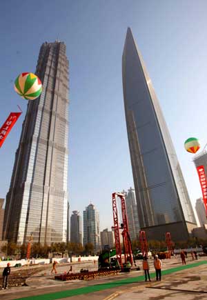 Updated: 2008-11-29 21:23 ![]() A photo taken on Nov. 29, 2008 shows the building site of Shanghai Center with Jin Mao Tower and Shanghai World Financial Center in the backdrop in Shanghai, East China. [Xinhua]