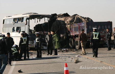 Policemen attend to the site where a coal truck collided with a bus on National Highway 314 in Kuqa, Xinjiang Uygur Autonomous Region at around 8:40 am, December 2, 2008. The death toll from the collision has risen to 22, with another 12 injured and three still in serious conditions, said local sources. [Asianewsphoto]