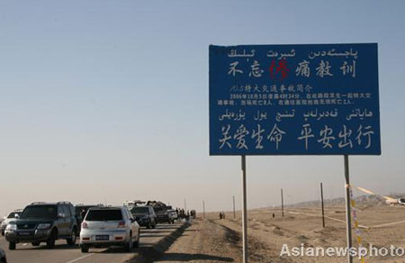 Updated: 2008-12-02 21:40 ![]() A placard board, warning passing vehicles of the highway accidents, is seen at the site where a coal truck collided with a bus on National Highway 314 in Kuqa, Xinjiang Uygur Autonomous Region at around 8:40 am, December 2, 2008. The death toll from the collision has risen to 22, with another 12 injured and three still in serious conditions, said local sources. [Asianewsphoto]