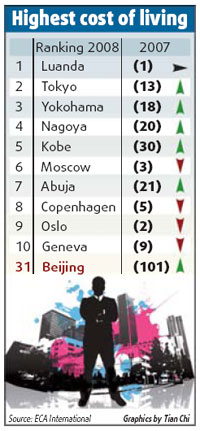 Rising costs pushed Beijing up to 31st place from 101st a year ago and Shanghai to 35th place from 106th, according to the survey by London-based ECA International, which advises companies globally on international assignments. China's consumer price index, the main gauge of inflation, was 6.7 percent for the first 10 months, after it fell to 4 percent in October from 7.1 percent in January. The Chinese currency has risen 20 percent against the US dollar since 2005, when the government de-pegged it from the greenback to link it with a basket of foreign currencies. But its rising trend has stalled recently as it continued to fall on Thursday for the fifth straight day, trading at 6.8837 per US dollar in the over-the-counter market. Hong Kong fell in the rankings to 97th spot in the latest survey, which compares a basket of 125 consumer goods and services commonly purchased by expatriates in more than 370 locations worldwide. Volatile exchange rates stemming from the global financial crisis also mean London and Seoul are no longer among the top 10 most expensive locations for expatriates. Meanwhile, Japanese cities have returned to upper end of the league table. London is now ranked 72nd in the global listing of expat locations while Seoul takes 90th place following their currencies' sharp depreciation in the past year. Angola's capital Luanda remains the costliest place for foreigners. That is mainly because certain items and brands typically required by expatriates are not readily available and therefore very expensive. Moscow has replaced Oslo as Europe's most costly location while a strong yen has made Tokyo the second-most expensive city in the world, up from 13th position a year ago. A 48 percent depreciation in the South Korean won means goods and services in Seoul - which a year ago were 5 percent more expensive than in Tokyo - are now 40 percent cheaper than prices in the Japanese capital, ECA said. Such sharp currency swings create a challenge for companies remunerating expat packages, most of which are based on an expat's home currency, says ECA. "Companies which split pay between the employee's home and host countries will be much better equipped to ride out the current currency volatility," said Lee Quane, Asia general manager of ECA International. The survey does not cover the cost of accommodation, school fees or car purchases, which ECA says are usually compensated for separately in expatriate packages. Manhattan shot up to 20th place - tying with Paris - from 54th a year ago as a rebounding US dollar made American locations, and locations with currencies tied to the dollar such as Hong Kong, much more expensive. "In the past two months, goods and services in Hong Kong have swung from being 10 percent cheaper than in London to being almost 10 percent more expensive," said Quane. The cost of living in Taipei and Singapore has also increased, helped by rising inflation. While a handful of African cities featured in the top 20, Africa is also home to the cheapest location for foreigners, Maseru in Lesotho. The latest survey was conducted in September but November exchange rates were used in the calculations. |