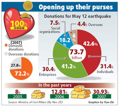 Updated: 2008-12-05 08:14 The amount of donations has hit a record 100 billion yuan ($14.7 billion) so far this year - exceeding the total for the past decade - thanks to a groundswell of support from individuals and the private sector, a senior official said on Thursday. The high figure is partly because of an outpouring of generosity after the Sichuan earthquake in May but still represents a quantum leap from say, 2005, when the amount was a mere 8 billion yuan. Earthquake relief efforts raised 73.7 billion yuan, a figure which includes contributions of about 13 billion yuan from Party members.