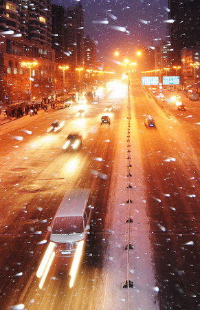 Vehicles travel on the street as heavy snow falls in Harbin, Northeast China's Heilongjiang Province, December 4, 2008. Vast areas from north to central China are experiencing a rare strong cold wave front in recent years, which have forced 26 provinces and municipalities to issue cold weather alerts.[Xinhua] |
