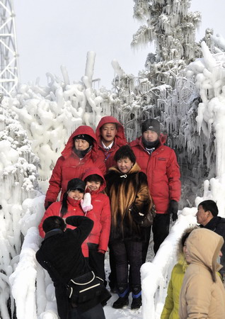 People pose for a picture among snow-covered trees in Aershan, North China's Inner Mongolia Autonomous Region, December 4, 2008. Vast areas from north to central China are experiencing a rare strong cold wave front in recent years, which have forced 26 provinces and municipalities to issue cold weather alerts.[Xinhua] |