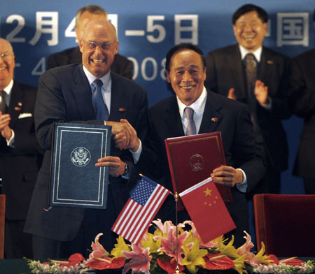 "These last two days, we have made progress on a number of important fronts. Our discussions have been productive, characterised by the straightforward back-and-forth that is only possible among colleagues who have built a relationship of trust and confidence. Broad participation on both sides allowed us to engage on a wide range of critical issues, from trade and investment to transportation, from currency reform to energy security, and from product safety to environmental sustainability. "We had a robust discussion of the current global financial market turmoil and economic downturn, its implications for both our nations and our efforts to address it. We are both committed to strengthening the global economy. I reviewed our efforts in the United States to stabilise our financial markets and restore our economy, and I welcomed the recent measures China has taken to strengthen domestic demand and maintain economic growth. As in the past, we discussed the importance of domestic-led growth, and the importance of a market-determined currency in promoting balanced growth in China that will contribute to a healthy global economy. I welcome the steps announced by the Chinese to further open their financial markets, such as allowing foreign banks to trade bonds on the same terms as Chinese banks. Strong financial markets will enable healthy economic development across China. "Protectionist sentiments grow during periods of economic downturn. We recognised this, and reiterated our commitment to fight protectionism, because open trade and investment are in the best interest of our people. Both nations reiterated the importance of completing a successful Doha round and meaningful progress toward that goal by the end of this year. The Chinese economy, like the US economy, depends on global trade, and China is stepping up its efforts to promote global growth and stability. I am particularly pleased to support China's membership in the Financial Stability Forum, which is charged with facilitating action on many of the global stability commitments endorsed by the G20 last month. To support trade flows during this period of financial turmoil, the US and China announced today that our two Export-Import Banks will make available an additional $20 billion for trade finance, particularly for creditworthy importers in developing economies. "This effort should support over $38 billion in annual financing for exports from the US and China and will benefit the global economy. Finally, global trade depends on the confidence of consumers in the safety of the products they buy. Again during this meeting of the SED, the US and China deepened cooperation on product safety and food safety protocols. "We also made significant strides at this meeting in cooperation on energy and the environment. Following up on the establishment of the Ten Year Framework for Energy and Environment Cooperation, which we launched at our SED meeting this past June, we announced today action plans on each of the five goals, and established a sixth goal of energy efficiency. The Ten Year Framework is a signature accomplishment of the SED. Sustained, comprehensive, constructive cooperation between the United States and China, reaching out to all parts of society, offers the best way to harness the resources and creativity of our two nations to meet the enormous environmental challenges facing our planet. "I particularly welcome yesterday's announcement of seven EcoPartnerships that will take concrete steps to share learning and test new ideas in targeted parts of both our nations. By creating partnerships between local governments in our two countries, and between US and Chinese universities and non-profits, these EcoPartnerships deepen the ties between the people of our two nations. Strong ties, on many levels, will contribute to the strength and vitality of the US-China relationship. "At this meeting, we have again shown that direct engagement is a pathway to success, that through engagement the United States and China can build a stronger relationship that benefits our citizens and the global economy. As I and my US colleagues take our leave, we all can be proud of what we have built in the SED. We have managed through times of tension, and through China's leadership transition earlier this year. The United States is now undergoing our own transition, and the US-China economic relationship will continue to be vital to the health of our two economies and the global economy. Our countries will no doubt face future challenges, and through the foundation of mutual respect, trust and candour fostered by the SED, I have no doubt we will manage through those challenges as well." |