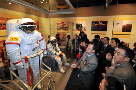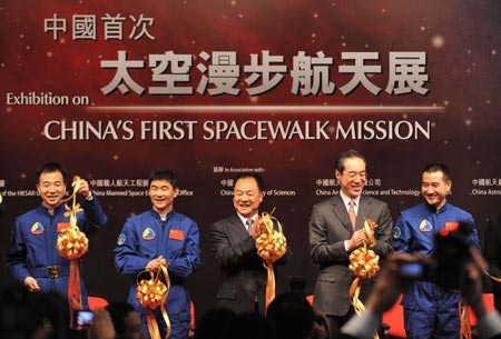 Three taikonauts of the Shenzhou VII space mission, Zhai Zhigang, Liu Boming and Jing Haipeng, joined other guests including Hong Kong Special Administrative Region (HKSAR) government's Chief Secretary for Administration Henry Tang to cut the ribbon at the opening ceremony of the exhibition at the Hong Kong Science Museum. In his opening speech at the exhibition, Tang welcomed the three taikonauts and other members of the Shenzhou VII delegation who arrived in Hong Kong Friday to start a four-day visit to the city.