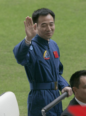 Astronauts Jing Haipeng waves to the crowd during a variety show to welcome the astronauts of the Shenzhou-7 space mission in Hong Kong, South China, December 7, 2008. [Agencies]