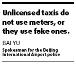 The men may be sent to a re-education camp, he said. The crackdown on the illegal activity was initiated after unlicensed cabs began returning to the airport after the Olympics, he said. Also, the number of cabs at the airport tends to increase on the approach to the Spring Festival, he said. Patrol cars and plainclothes officers were used to identify the illegal cabs, Bai said. One driver was detained after trying to charge a foreign passenger $20 for a journey that should have cost 10 yuan ($1.50), the police said in a release sent to China Daily. "Foreigners are easy prey as they don't know the routes or the fares," Bai said. People arriving at the airport should take only those taxis working from the designated stops, he said. "Unlicensed taxis do not use meters, or they use fake ones, and will try to cheat passengers into paying more than they should," he said. Zhao Jun, a criminal lawyer, said police can detain unlicensed taxi drivers if they are caught more than once. "Unlicensed taxi drivers' violate public order, and they can be detained and sent for re-education if they are caught," he said. It is illegal for the owners of unlicensed, private cars to engage in profit-making activities, and those who do face fines of up to 20,000 yuan, the Beijing public transport administration said. Wang Dayong, who has worked as a taxi driver in Beijing for the past 13 years, said he supports the recent crackdown. "The police are also protecting our interests, as unlicensed cabs are affecting our income," he said. Rashid Amin, a Bangladeshi who has been studying at the Central Academy of Fine Arts in Beijing for the past six years, said he would never take an unlicensed taxi. "I know which cabs don't have a license, and I won't use them," he said. |