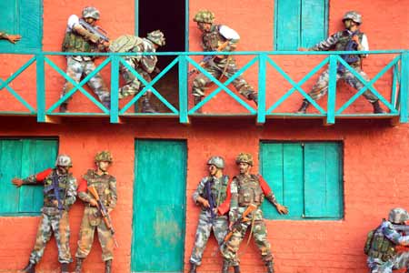 Chinese and Indian soldiers attend the comprehensive drills of the "Hand in Hand 2008" China-India army joint anti-terrorism training in Belgaum of India, December 10, 2008. The training sessions of the joint anti-terrorism training went on smoothly. During the sessions, the soldiers will train in anti-terror shooting and raids, exchange views on anti-terror theories and civilian and judicial issues, and carry out comprehensive drills with the theme of closing, controlling and searching. [Xinhua]