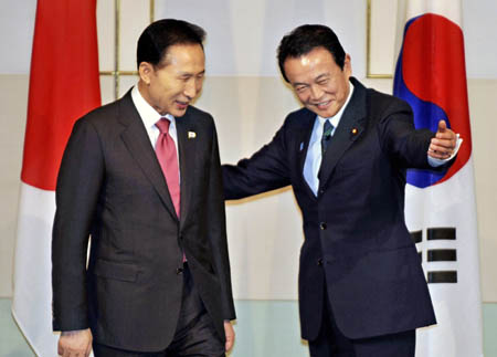 Updated: 2008-12-13 11:18 ![]() Japanese Prime Minister Taro Aso (R) welcomes South Korean President Lee Myung-bak prior to their talks in Fukuoka, western Japan, December 13, 2008. Japan and South Korea agreed on Saturday to beef up cooperation in tackling fallout from a global financial crisis battering the economies of the North Asian neighbours. [Agencies]