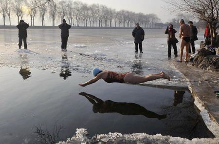 Winter swimmers enjoy icy water