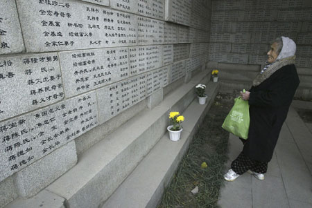 An old woman who lived through the Nanjing Massacre pays tribute to the victims of the Nanjing Massacre during a ceremony marking its 71st anniversary in Nanjing, Jiangsu province December 13, 2008. [Agencies] |