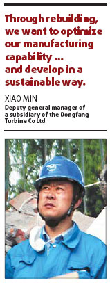 The company's manufacturing capacity was 2.8 million kilowatts, or a contract value of about 10 billion yuan ($1.46 billion), before the tremor halted operations, a circular of parent company Dongfang Electric stated. The direct economic loss of Dongfang from the quake is about 5 billion yuan, said Xiao, who joined the company located in the mountains after he graduated from college 25 years ago. In the immediate aftermath of the quake, Xiao helped managed relief work to pull Dongfang workers and students buried under the debris. Now the deputy director has piles of documents to sift through as the subsidiary rebuilds its factory. The wall outside his makeshift office displays construction deadlines to meet for the 5-billion-yuan project, slated for completion by May 12, 2010. Red flags, of which there are few, mark tasks met. Xiao is approaching the challenges brought about by the quake and economic recession as opportunities to forge a more sustainable enterprise for the future. "We were developing rapidly before the earthquake, but costs were still too high," Xiao said. With the country's demand for power increasing, so too was that for turbines. But the capacity of the factory, which was designed in the 1960s, could not keep up with the growth. Xiao said the company is now being steered toward meeting market demands better. "Through rebuilding, we want to optimize our manufacturing capability ... and develop in a sustainable way," he said. To that effect, Xiao said the Hanwang factory will expand projects to allow for wind and nuclear power. Future demand remained uncertain, he added. "We need to proceed carefully and it is possible we will have no work after the new factory is completed, if the market remains gloomy," Xiao said. Other challenges include building new homes for more than 5,000 workers. "We were used to the simple life in villages before the quake," Xiao said. "We would buy the local vegetables and cook them at home for our dinner," he said. Now the workers and their families have to adjust to life in the city, Xiao said. In a publication circulated within the company, a girl who moved to the Dongfang subsidiary in Deyang after losing her home in Hanwang after the quake wrote: "I had been dreaming of the life of big cities. I thought urban life was colorful, but now that I am here, I feel there is nothing in it for me.". "Our people overstretched themselves to meet the huge demand and fast growth," Xiao said. "The employees almost had no life outside of work." Despite the "remarkable" achievements in business, Xiao said the cost was "too high". There are plans to have facilities in rebuilding work to ensure life for these quake victims is comfortable, Xiao said. "Our colleagues did not really enjoy the fruits of our labor before. We want them to live happily in their new home," he said. There are other bright spots on the horizon, Xiao said. Prices for raw materials are going down for now, with many other construction projects being stopped as a result of cash flow problems faced by real estate companies, Xiao said. This means construction costs "could be cheaper and there would be enough labor to ensure the project is delivered on time", he said. With more than 1,000 Dongfang workers left disabled and hospitalized from the quake, Xiao said the new factory will also incorporate opportunities for these victims to continue working. "We will make machines easy to operate, we don't want our former colleagues to feel they are useless after the disaster," he said. |
