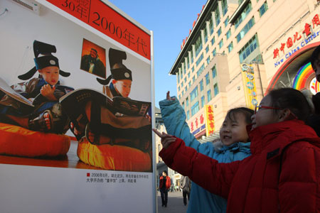 Two girls look at a photo during an exhibition in Beijing's Wangfujing area, December 17, 2008. The show features about 800 photos taken across the country during the past three decades to highlight the major changes China has gone through since 1978. [Asianewsphoto]