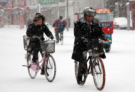 ![]() Local residents ride bicycle on a snow-covered road in north China's Tianjin municipality, December 21, 2008 after a heavy snowfall hit the city Saturday night. [Xinhua]