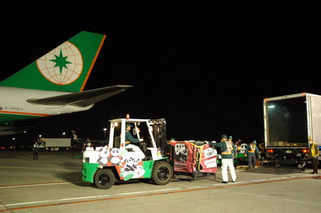 ![]() People load the cage containing Tuan Tuan and Yuan Yuan, two giant pandas from Chinese mainland, onto a truck which will head to Taipei zoo in Muzha December 23, 2008. The pair of giant pandas left their base in the mountainous southwestern province of Sichuan on Tuesday for Taiwan. [Xinhua]