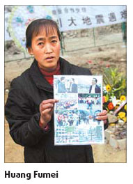 But Huang had no time to dwell on the past. She wiped off the tears and headed for her small shop in Beichuan town's middle school, which had collapsed in the 8.0-magnitude quake. Huang's makeshift photo shop consisted of a table set with A4-paper-sized photos of the area before and after the quake, for sale to visitors commemorating the disaster and remembering those who died in it. The stall lay meters away from the rubble of the school building, sealed off for safety reasons. "I started my small business here because it was where my son died. I want to stay with him, every day," said Huang, 40. Beichuan - the country's only Qiang ethnic autonomous county - was leveled by the earthquake and the government deemed it too dangerous to rebuild there. More than 10,000 people, about half of the total local population, died. The town's middle school collapsed under the weight of a giant rockslide, swallowing Huang's son, 15-year-old Wang Shuangshuang, and hundreds of other children. In total, nearly 70,000 people are confirmed dead and another 18,000 are still missing in the massive quake that was felt in Sichuan, Gansu and Shaanxi provinces. "This year is truly the most tragic. We know we are the lucky ones, to still be alive," Huang said.