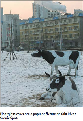 "There are more South Koreans these days," says Feng. "They have the businesses, cars and money." They also create jobs and bring expertise. Man Soon-noh runs Jang Sa Bu, one of a chain of restaurants specializing in chicken ginseng soup, with a pleasant wooden dcor and large flat-screen TV. She is from Seoul and her husband is a local businessman. They shuttle between the two places on direct flights that started last year. Business is good, she says through a Korean/Chinese staff member who also acts as an interpreter, adding she feels at home even though she doesn't speak Mandarin. She's not the only one. According to the Dandong government website, the city of 750,000 people is home to more than 20,000 Koreans, while 30 percent of the population is ethnically Manchu and has its own dialect. Dandong is not one of those places that never sleeps, it has a natural rhythm and stirs at first light when workers pour into the ports and factories. This is a boom time for the city that was known as Andong before 1965, for its historic role as a border city and "pacifying the east". More recently Dandong has been attempting to turn itself into a service oriented city and tourism hub for the region. The sight of fiberglass cows "grazing" on snow-covered grass at Yalu River Scenic Spot, framed by construction and factory smoke, sums it up. |