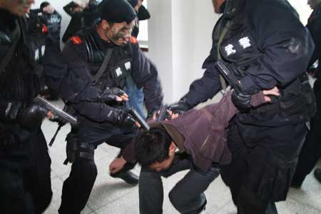 ![]() Members of a local special armed police unit capture an impersonative suspect during an anti-hostage-taking drill in Guiyang, capital of southwest China's Guizhou Province, Dec. 25, 2008. [Xinhua]