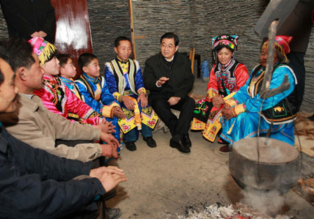 It was Hu's second visit after the May 12 earthquake. Hu's last visit was on May 16, when quake relief work was in a critical phase. The 8.0-magnitude quake, centered in Wenchuan County, left more than 69,000 people dead, 374,000 injured, 18,000 missing and millions homeless. From Saturday to Monday, Hu visited reconstruction sites, factories, villages, resettlement centers, schools and clinics in battered Mianyang, Deyang, Chengdu and Aba, giving residents and those helping with rebuilding work new year's greetings. In villages and resettlement centers, Hu went into homes and even the kitchens and bedrooms of local people to see if they were warm enough and well-fed. "The most important thing is to make sure all people are housed, have clothes and quilts to resist the cold, have enough food for the winter and coming spring, and medical service and epidemic prevention are in place," he said.