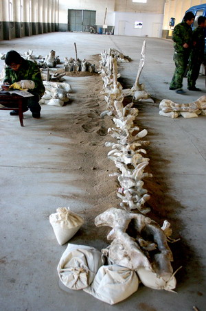 "The discoveries are expected to contribute to research on the mystery of dinosaur extinction," Zhao said. He added that the fossils dated mainly from the Late Cretaceous of the Mesozoic Period, when dinosaurs became extinct. The city has a major field of large hadrosaurus fossils, discovered in the 1960s by a Chinese oil expedition. More than 50 tons of fossils have been discovered since then. The world's largest hadrosaurus fossil was found here in the 1980s and exhibited in the local museum. A new fossil site was found during another mining expedition in March in Longdu, Shunwang, Jiayue and Zhigou Towns. One field in Longdu is 300meters long by 10m wide and 5m deep. More than 3,000 fossils have been found at that site, among which new genera or species might be found, Zhao said. A 2m skull of a large ceratopsian was found here, the first such discovery outside of North America, said Xu Xing, researcher of the Institute of Vertebrate Paleontology and Paleoanthropology. In the 15 sub-fields, other new genera of ankylosaurus, tyrannosaurus and ceolurus were also found, Xu said. Zhao said the fossils had only the slimmest chance to have survived all these years. According to current research, the region might have been a watery area with abundant grass. That would have made it an ideal habitat for duck-billed dinosaurs, Zhao said. The geologists said there might have been a volcanic eruption that was fatal to the dinosaurs and later a flood that brought the fossils to their resting place. Mining had been suspended because of weather but would resume in the spring, Zhao said. Research on the findings would be published at the end of next year, he said. A fossil park will be built in the region, local authorities said. |